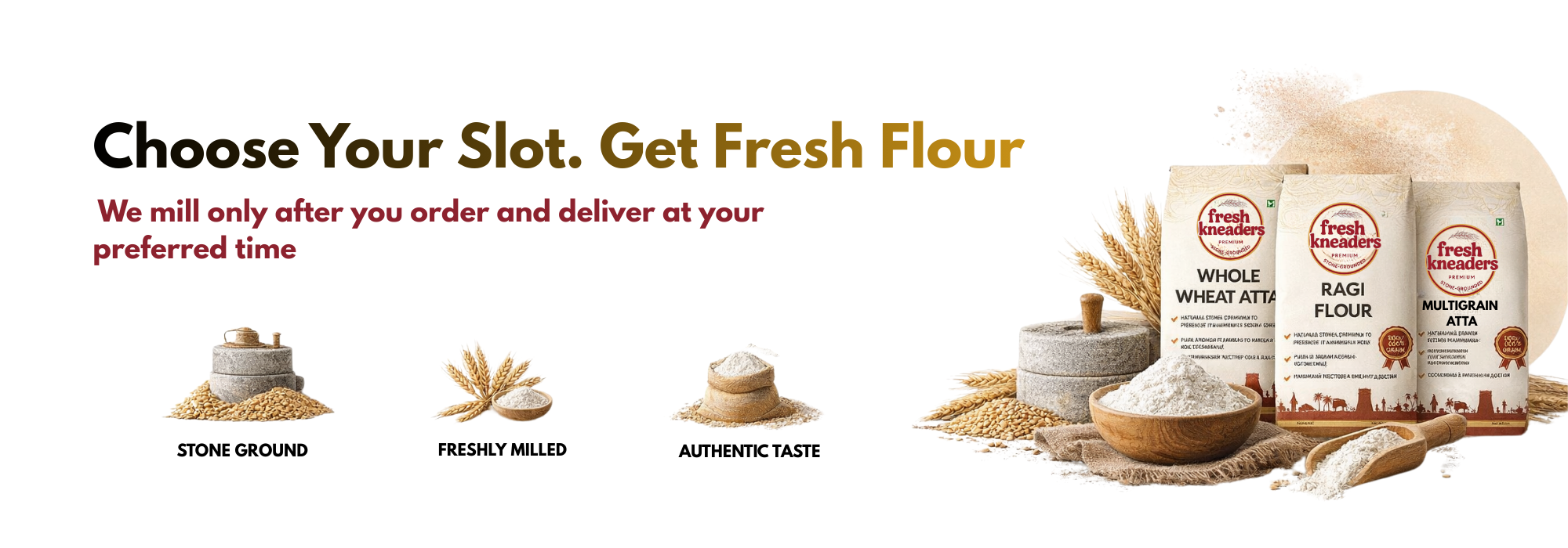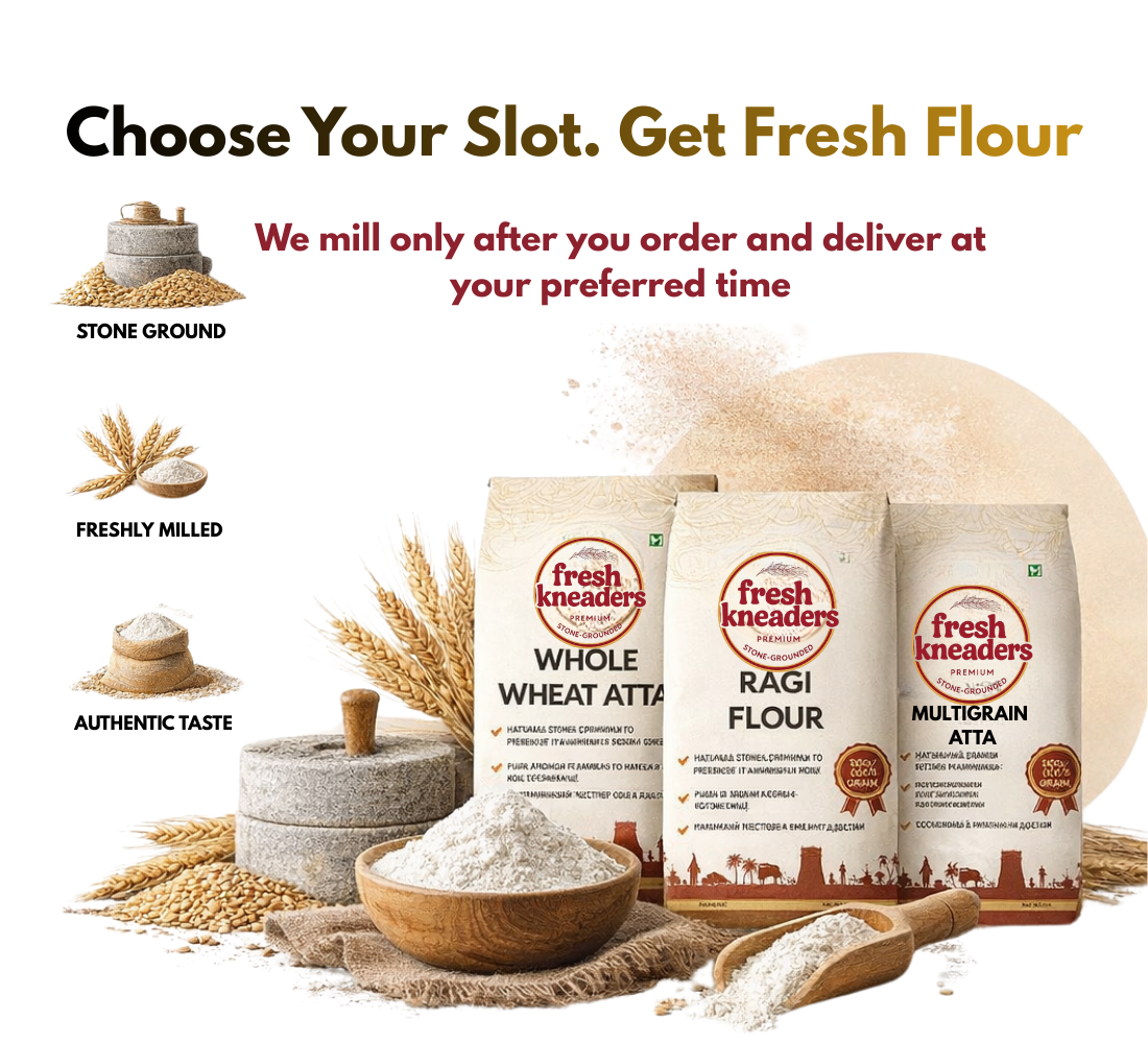 We specialize in premium Sharbati Atta and deliver 100% fresh, stone-ground flours straight from the chakki. Made from carefully selected grains, packed immediately, and free from preservatives, our flours ensure every meal is healthy, natural, and full of authentic taste.